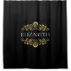 An elegant black and gold flourish monogram shower curtain. Add your name between the gold floral flourish on the front. Designed for you by Blackberry Boulevard.