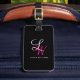 Rose gold and blush pink monogram luggage tag featuring trendy monogram with initials and a name in pink and blush pink colour on a black background.