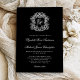 This elegant black and white monogram wedding invitation features an ornate crest with interlocked fancy script calligraphy for the initials of the bride and groom and the names. Find matching products in the collection, or message me through Zazzle Chat for more products and design tweaks.