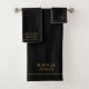 Personalised elegant monogram black gold serif first name and script last name, bathroom towel set gold border on black. Refresh your bathroom decor with a minimalist typographic style.