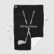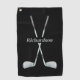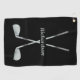 Elegant Monogram Golf Towel with crossed golf clubs in watercolor silver on black background.