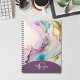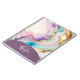 A feminine elegant liquid ink design in pink, purple, turquoise and gold. Personalised with monogram and name.