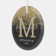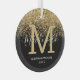 Family monogram christmas glass ornament featuring a trendy black background, a elegant gold glitter waterfall design, your initial, family name, first names, and the year.