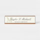 Neutral, elegant nameplate with your initial in a pale golden colour against creamy white under your name and title in so dark brown it's almost black.