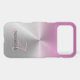 This phone case design features a pink ombre background over faux metal with pink script initial letter monogram and name. Personalize the text fields, remove any or all text or click customize to select a font style, size, and color you like.