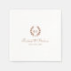 Elegant wedding napkins featuring a simple laurel wreath framing the couple's initials. Inspired by 1920s invitations, it blends classic formality with modern flair, using a traditional serif font, vintage calligraphy script and a clean arrangement. Personalise the template with the couple's names, monogram, and ceremony date. Perfect for wedding receptions, rehearsal dinners, engagement parties, cocktail parties, anniversaries and formal events. Printed colours: terracotta brown. Shop the collection for matching stationery and supplies for sale online!