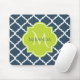 An elegant navy blue quatrefoil patterned mousepad with a scalloped badge in a vibrant spring green that you can personalise by adding your name and monogrammed initial to. This is part of the Sailor Blue and Lime Punch Spring Collection.