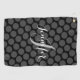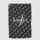 Slate grey polka dotted pattern on black background with elegant script name and monogram centred on towel