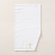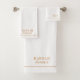 Personalised elegant monogram gold serif first name and script last name, bathroom towel set white border on white. Refresh your bathroom decor with a minimalist typographic style.