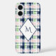 Personalise Your Phone with Preppy Flair! This stylish phone case features preppy plaid brushstrok pattern in navy blue, pink, and green, accented by an elegant custom monogram in a diamond frame. Protect your phone while showcasing your unique style.