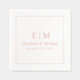 Enhance your wedding celebration with our *Elegant Monogrammed Typography Script Wedding Rose Gold Foil Napkins*. These exquisite napkins feature real rose gold foil on a crisp white background, elegantly showcasing a monogram framed within a simple box, adding a touch of sophistication to your table settings.