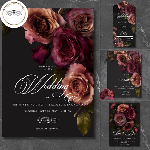 Embrace timeless elegance for your gothic-inspired celebration with our captivating wedding invitation. A soft black background provides the perfect canvas for a captivating, yet understated bouquet. Imagine a corner arrangement of muted rose blooms, where soft rust blush and rich burgundy hues mingle with dark green foliage. This ethereal design exudes quiet sophistication, perfect for the couple seeking a touch of romantic darkness. Your wedding details are showcased in a modern font, ensuring they stand out beautifully. This enchanting design creates a truly unforgettable invitation for your special day, setting the tone for a moody and elegant celebration of love. Created by Simply Farmhouse Press.