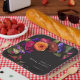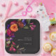 Embrace the opulent beauty of a fall floral harvest with our captivating bridal shower paper plates. A dramatic, yet soft black background provides the perfect canvas for a breathtakingly realistic bouquet. Imagine a vibrant explosion of colour, featuring roses in orange and dark magenta, with small magenta pink flowers and purple violets and alongside peach mums and other vibrant florals. Lush, dark green foliage completes the arrangement, adding a touch of natural elegance. This captivating design is perfect for any season, reflecting the passionate intensity of your love story. Your event details appear in a clean, modern white font, ensuring they stand out beautifully against the dramatic backdrop. This enchanting design creates a truly unforgettable design to celebrate your special day. Created by Simply Farmhouse Press.