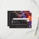 Embrace the opulent beauty of a fall floral harvest with our captivating wedding response card with details but no dinner choices. A dramatic, yet soft black background provides the perfect canvas for a breathtakingly realistic bouquet. Imagine a vibrant explosion of colour, featuring roses in orange and dark magenta, with small magenta pink flowers and purple violets and alongside peach mums and other vibrant florals. Lush, dark green foliage completes the arrangement, adding a touch of natural elegance. This captivating design is perfect for any season, reflecting the passionate intensity of your love story. Your wedding details are showcased in elegant script, ensuring they stand out beautifully against the dramatic backdrop. This enchanting design creates a truly unforgettable invitation to celebrate your special day. Created by Simply Farmhouse Press.