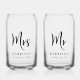 Elegant personalised keepsake can glass set for the bride and groom to celebrate with at their engagement party, rehearsal dinner, wedding reception and other events featuring "Mr" and "Mrs" in a large chic script and your new family name and wedding date in classic elegant serif typography.