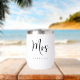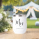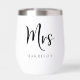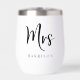Elegant personalised thermal wine tumbler for a bride or wife to celebrate their wedding or married life featuring "Mrs" in a large chic script and your family name in classic serif typography. A matching "Mr" tumbler is available - message us for the link.