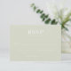 This elegant wedding RSVP card features a minimalist design with a soft, muted green background that exudes serenity and sophistication. The layout is clean and organized, with bold serif typography for the "RSVP" heading and clear sans-serif fonts for response options, creating a modern yet classic look. A simple line divides the header from the response section, which offers two customizable choices for acceptance or decline, along with space to note the number of attendees. The overall mood is calm and inviting, perfect for formal events where clarity and elegance are key.