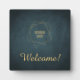 Luxury exclusive welcome counter shelf barbershop / hair salon / small business display plaque with gold geometric shapes and elegant typography on a dark navy vintage chalkboard style background.