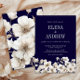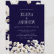 This elegant navy & white floral wedding invitation features fall & winter flowers. Navy background shown with white text and white wedding flowers. Background of bigger white florals is optional. All text, including names, can be changed.