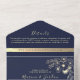 Make a statement with this elegant navy blue and faux gold floral all-in-one wedding invitation. This folded design includes a built-in RSVP section, detailed wedding information, and an integrated envelope — no assembly required. The romantic botanical illustration and rich navy palette make it ideal for formal, evening, or luxury weddings.