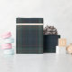 Modern Christmas wrapping paper featuring a timeless design with a muted navy blue and green plaid pattern.
