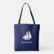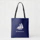 Elegant Navy Blue and White Sailing Yacht Tote Bag. Text can be personalised.