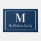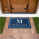 Freshen up your home's entrance with this elegant custom monogram doormat in classic navy blue and white colours. Note, colours can be modified. Personalise with your family's last name in script and a serif style monogram initial. Design includes a simple framed border.