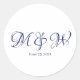 Elegant navy blue and white custom script calligraphy monogram initials and date wedding Classic Round Stickers, seals, labels.