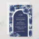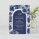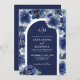 A stunning navy blue, white and black floral wedding invitation that works perfectly for any season of the year! A mix of elegant and modern, this invitation features watercolor flowers in navy blue and dusty blue hues, and greenery and foliage. A trendy arch frames out the text while a couple of the flowers pop out the front. A mix of a classic serif font and some script typography. The background of the arch is a navy blue colouring right now, with a white frame, but you can change them to any colour. You can also change out the fonts that are currently white. A simple initial monogram is on front and back for an extra personalised touch for the couple. Elegant Modern Watercolor Navy Blue Floral Wedding Invitation.