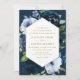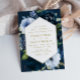floral design with editable text and watercolor navy and blue flowers with gold text.