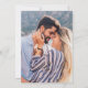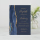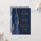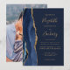 The left-hand edge of this elegant modern wedding invitation features a navy blue watercolor agate border trimmed with faux gold glitter. The customisable text combines gold-coloured handwriting, copperplate and italic fonts on a navy blue background. Easily replace the sample image on the back with your own vertical photo.