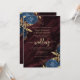 This elegant wedding invitation features blue floral bouquets set off with gold faux foil greenery in two corners, on a background image of burgundy watercolor agate. The customizable text combines gold-colored serif, italic and handwriting fonts. The reverse side features a matching floral and agate design.