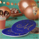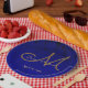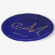 Elegant navy blue gold floral monogram wedding reception decor. Beautiful elegant custom round paper plates. Chic, modern, trendy, classy, stylish, succulent metallic pattern. To change the script, click on edit design. Image copyright Marg Seregelyi Photography.