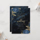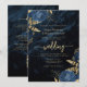 This elegant wedding invitation features blue floral bouquets set off with gold faux foil greenery in two corners, on a background image of navy blue watercolor agate. The customisable text combines gold-coloured serif, italic and handwriting fonts. The reverse side provides space for wedding details, along with a QR code guests can scan to visit your website and RSVP, which saves the cost of printing and mailing separate RSVP cards.