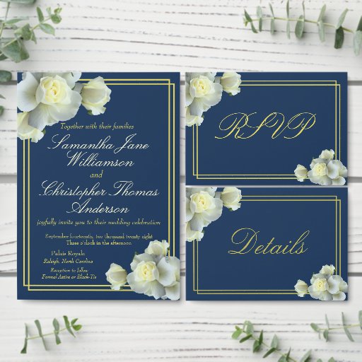Elegant Navy Gold Script White Rose Wedding SuiteDesigned by Katrin Z