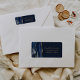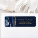 The left-hand edge of this elegant modern wedding invitation return address label features a navy blue watercolor agate border trimmed with faux gold glitter. The customisable text combines gold coloured handwriting and copperplate fonts on a navy blue background.