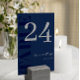 Elegant typography wedding table number cards in muted navy blue with TABLE in large letters down the side of the navy blue table number cards. Add names and wedding date in silver grey.
