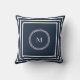Custom monogram throw pillow in navy blue with sleek white frame. A perfect accent for modern or traditional interiors.