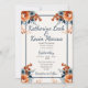 This is an elegant navy blue and burnt orange floral wedding invitation with blue and orange watercolor flowers on a light orange background design. It is perfect for a summer or fall garden wedding celebration.