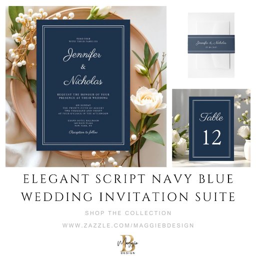 Elegant Script Navy Blue Wedding Invitation SuiteDesigned by Maggie B Design