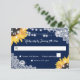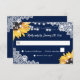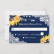 Elegant navy blue rustic floral wedding RSVP card featuring sunflowers, white floral lace and string lights against a burlap background. Perfect card design to complement your navy blue rustic wedding party inspired by sunflower flowers.