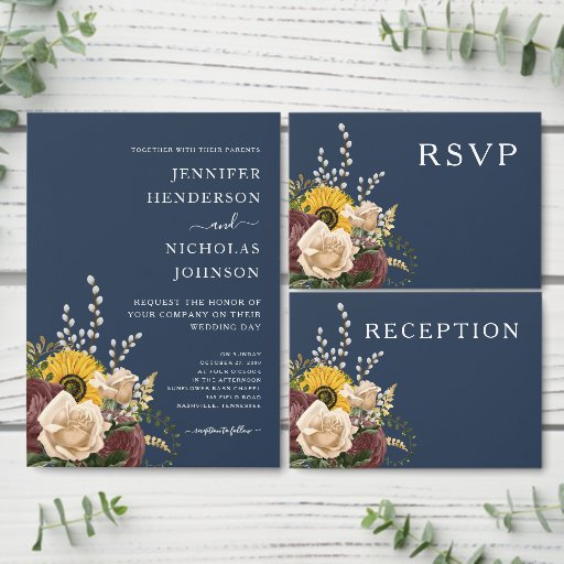 Elegant Navy Blue Floral Sunflower Wedding SuiteDesigned by Maggie B Design