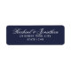 This return address label features bride and groom's name in white elegant script font with address in white classic serif font on navy blue background.