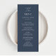 Complete your reception tablescape with this elegant navy blue wedding menu card. Featuring a minimalist design with modern script accents and clean typography, it’s the perfect way to showcase your wedding dinner courses in style. Ideal for classic, modern, nautical, or elegant wedding themes, this menu card pairs beautifully with matching invitations, RSVP cards, table numbers, and thank you cards from the same collection.