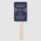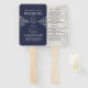 Elegant modern simple calligraphy navy blue wedding program hand fans with silver rope heart and gilded floral lace.
