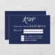 Elegant navy blue and white wedding RSVP cards with navy blue background and white changeable text and decorative white graphics