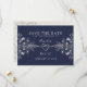 Elegant modern calligraphy script navy blue wedding save the date invitation with simple silver rope heart and gilded floral lace.
