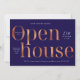 Create modern business invites for your real estate event or open house with this elegant navy blue and bronze gold effect Open House Invitation. This professional property sale event invitation features a minimal layout with bold serif fonts and space for your logo and custom event details.