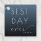 This elegant wedding favour tag features a gradient background transitioning from deep navy blue to light teal, creating a sophisticated and modern look. The phrase "BEST DAY ever" is prominently displayed in a mix of clean sans-serif and flowing cursive fonts, adding both clarity and charm. Customisable date options allow for personalisation, making it perfect for commemorating special occasions. The minimalist design focuses on typography, ensuring readability while conveying a celebratory mood ideal for weddings or milestone events.