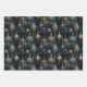 Beautiful and elegant Christmas gift wrap with a whimsical array of navy and gold ornaments and swirls.